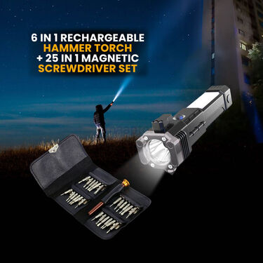 A versatile 6-in-1 hammer torch with an all-in-one design that saves space and provides essential tools for emergencies and daily tasks, combined with a 25-in-1 magnetic screwdriver set, making it perfect for both urgent situations and routine repairs.