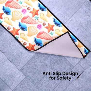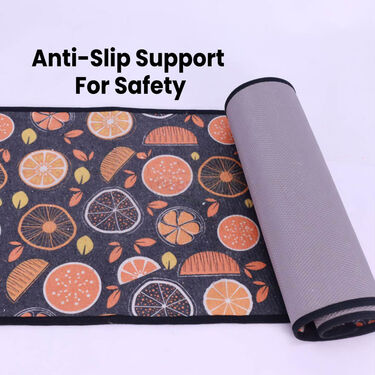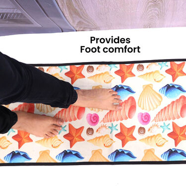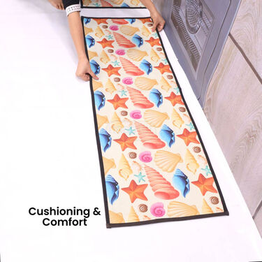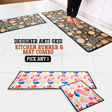 The Designer Antiskid Kitchen Runner & Mat Combo is a perfect blend of comfort, safety, and style for your kitchen. Its cushioning provides comfort during prolonged standing, while the anti-slip surface reduces the risk of slipping on wet floors. With vibrant designs like the Shell or Fruit patterns, it enhances your kitchen's aesthetics and adds functionality. The combo is easy to clean and maintain, offering a practical solution to protect your floors from spills, stains, and wear.
