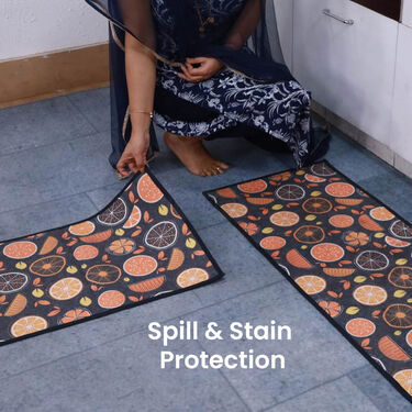 The Designer Antiskid Kitchen Runner & Mat Combo acts as a protective barrier against spills, stains, and water damage, especially in high-risk areas like near the sink or stove. It helps maintain the cleanliness of your kitchen floors by preventing liquids from seeping in.