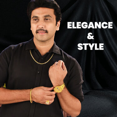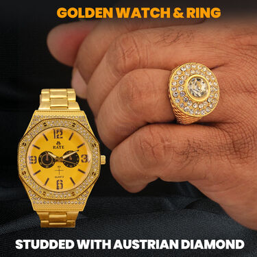 Elevate your style with this stunning set including a golden watch, two chains, a bracelet, and a ring. Crafted with meticulous detail, each piece exudes elegance and sophistication. The water-resistant analog watch features a stainless steel strap and Austrian diamond detailing. The curb design and golden finish of the chains add a touch of luxury to any outfit. The bracelet boasts a stylish golden finish and comfortable fit, while the adjustable ring adds a final flourish with its Austrian diamond accent. Perfect for casual, party, or formal occasions, this set is a timeless addition to any wardrobe