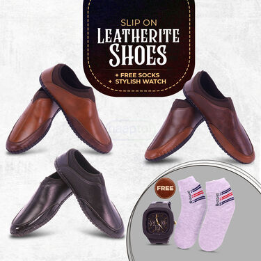 Get stylish slip-on leatherite shoes designed for all-day comfort with FREE socks and a FREE stylish watch. Perfect for everyday wear with breathable material and an anti-skid sole for added safety.