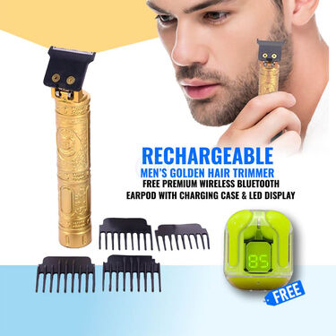 Rechargeable Mens Golden Hair Trimmer + FREE Premium Wireless Bluetooth Earpod with Charging case and LED display (PMT1WP2)